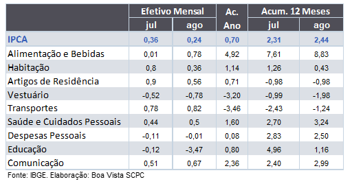 O Índice Nacional de Preços ao Consumidor Amplo (IPCA)[1] avançou 0,24% no mês de agosto. No acumulado em 12 meses houve evolução para 2,44%, 0,13 p.p. acima da variação observada em julho. Com esse resultado, o indicador acumulou alta de 0,70% no ano.