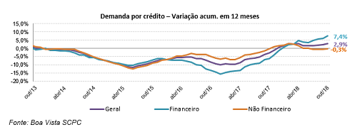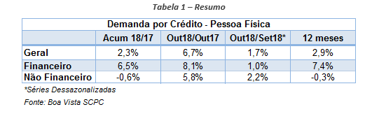 A Demanda por Crédito do Consumidor avançou 1,7% em outubro na comparação mensal dessazonalizada, de acordo com dados nacionais da Boa Vista SCPC. No acumulado em 12 meses, o indicador subiu 2,9% (novembro de 2017 até outubro de 2018 frente aos 12 meses antecedentes). Na avaliação interanual, outubro apresentou alta de 6,7%.