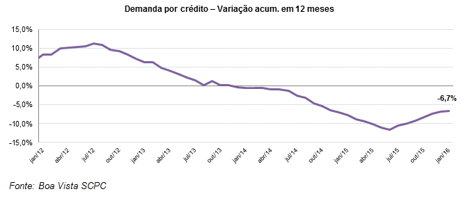 A demanda do consumidor por crédito apontou queda de 2,8% em janeiro de 2016, na avaliação mensal, de acordo com dados nacionais da Boa Vista SCPC (Serviço Central de Proteção ao Crédito), na série de dados com ajuste sazonal. Na variação acumulada em 12 meses o indicador manteve a queda de 6,7% registrada em dezembro. Já na avaliação contra o mesmo mês de 2015, o indicador obteve retração de 9,4%.