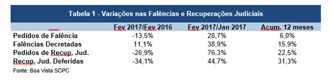 Considerando os resultados de longo prazo (acumulados em 12 meses), os indicadores de falências e recuperações judiciais demonstraram continuidade da tendência de desaceleração dos meses anteriores. Em comparação a fevereiro de 2016 os indicadores de solvência apresentaram resultados mais favoráveis, devido as melhores condições macroeconômicas, tais como a redução dos juros e desaceleração da inflação, e a retomada das expectativas em relação a atividade econômica e dos investimentos.